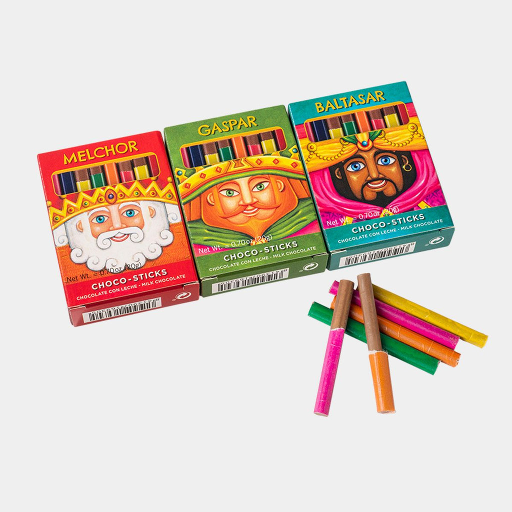 Choco Sticks de chocolate con leche tematizados para el momento de los Reyes Magos. Cada caja contiene 20g de choco sticks de chocolate con leche ideales para compartir entre los más pequeños de la casa durante el momento de los Reyes Magos. Grupo de 3 cajas de 20g (con 8 bastoncillos).