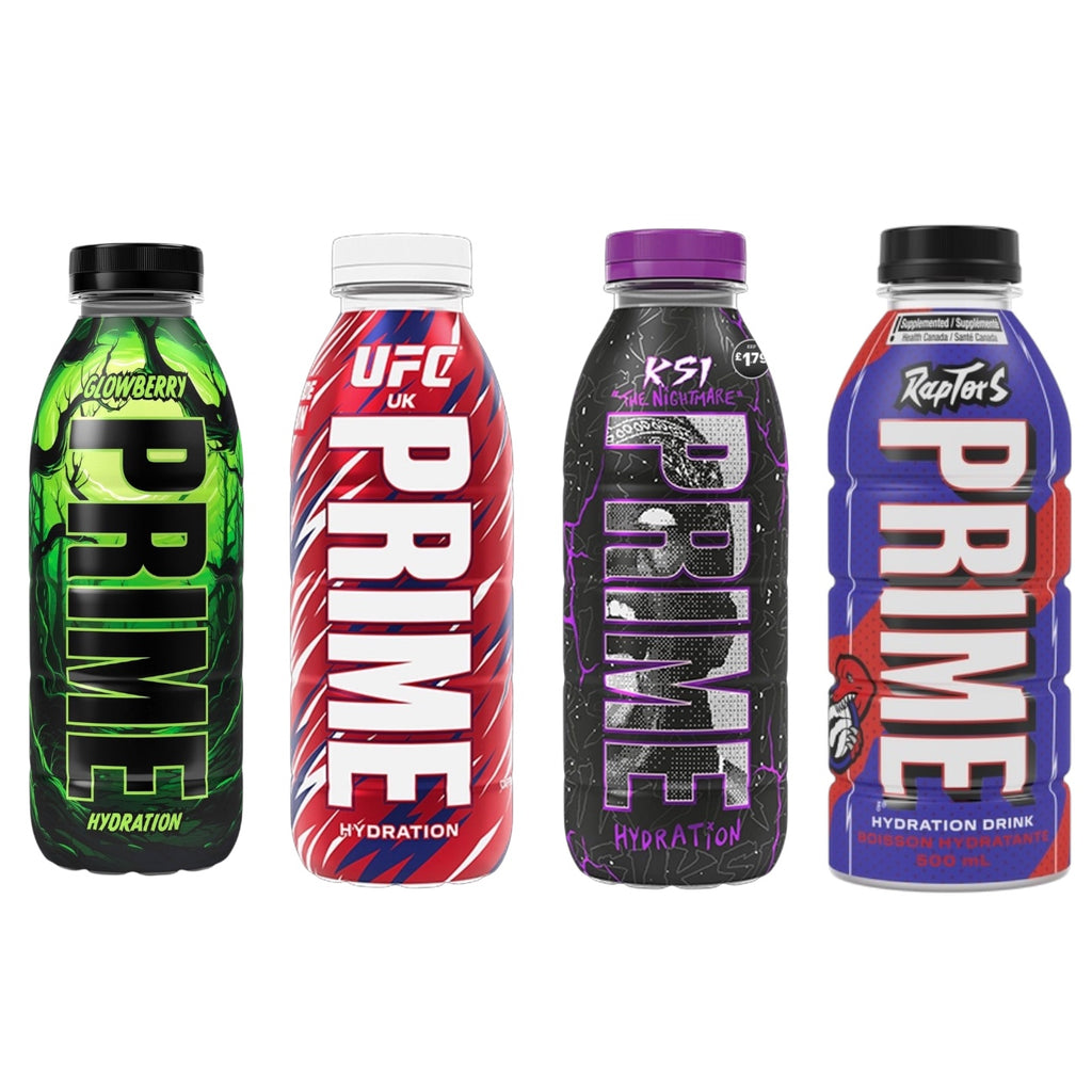 Disfruta de un pack irresistible con las ediciones más especiales de Prime Hydration: Glowberry (edición limitada), UFC, KSI The Nightmare y Raptors. Una combinación única de sabores y diseños icónicos.